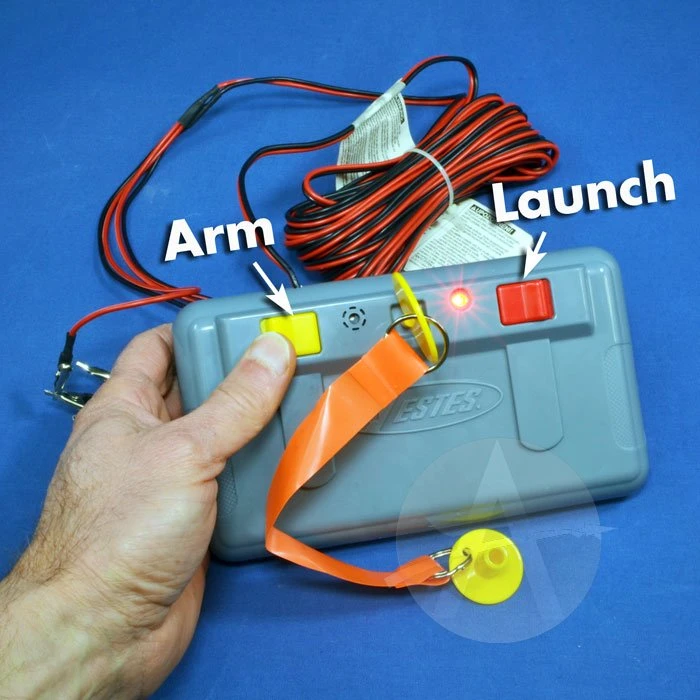 The Estes Pro Series II launch controller is a portable controller that has safety in mind. Requires two hands to launch the rocket. It has 9 volts of power, and two sets of clips to launch a cluster of motors.