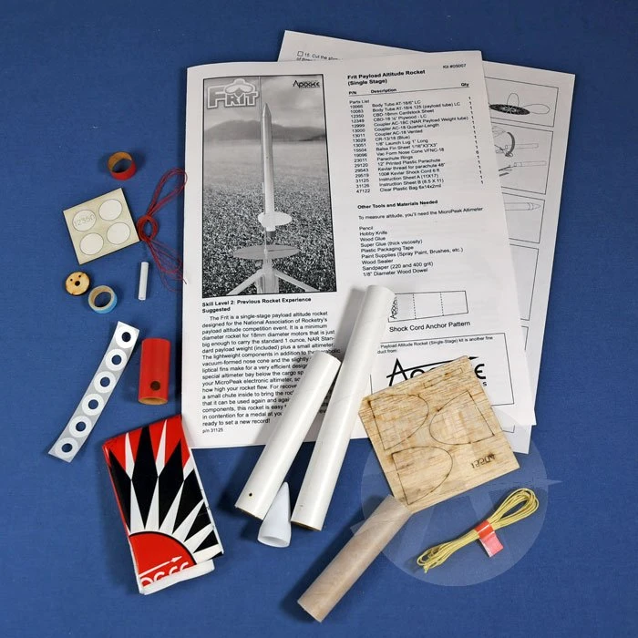 The “Frit” rocket is a contest model designed for the Payload-Altitude event. It is a simple, single stage rocket that set an altitude record the first time it was launched in competition, shattering the old record by 180 meters. It is designed specifically for the NAR’s competition event where the object is to boost a 1 ounce payload as high as possible. Use in “C” engine class for flights over 350m (1150 feet). Can also be used in “A” and “B” motor contests, especially when the day is breezy.