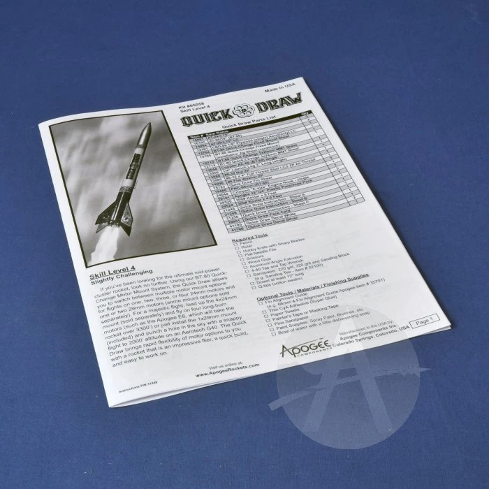 The Quick Draw is a rocket that gives you options. Fly it simply with a single 29mm motor, or thrill the crowds with a cluster flight on three roaring 24mm composite motors. You decide, at the field. And, you can change back anytime you like.