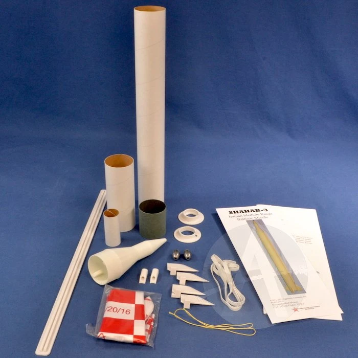 This 1/27th scale model of the SHAHAB-3 is similar to the old SCUD missile. This model rocket kit is simple to build and flies great on 24mm diameter motors.