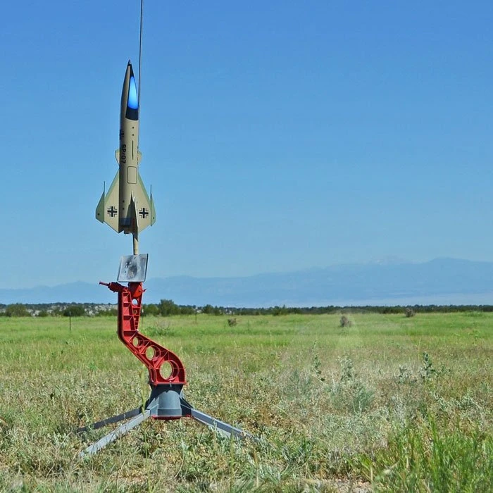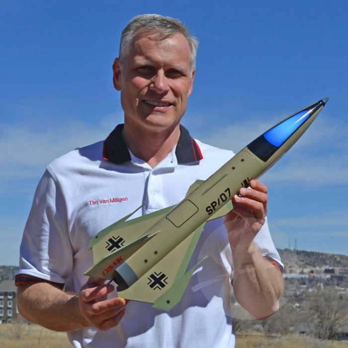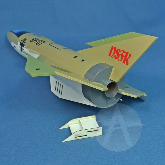 This rocket-powered fighter is what might have been developed in a parallel universe where the NAZI’s won World War II. It is a great example of retrofuturism from the creative mind of Shrox. The easy-to-build kit features through the wall fins, colorful self-adhesive vinyl decals, and a color plastic parachute. Flies on 24mm C, D, and E size rocket engines.