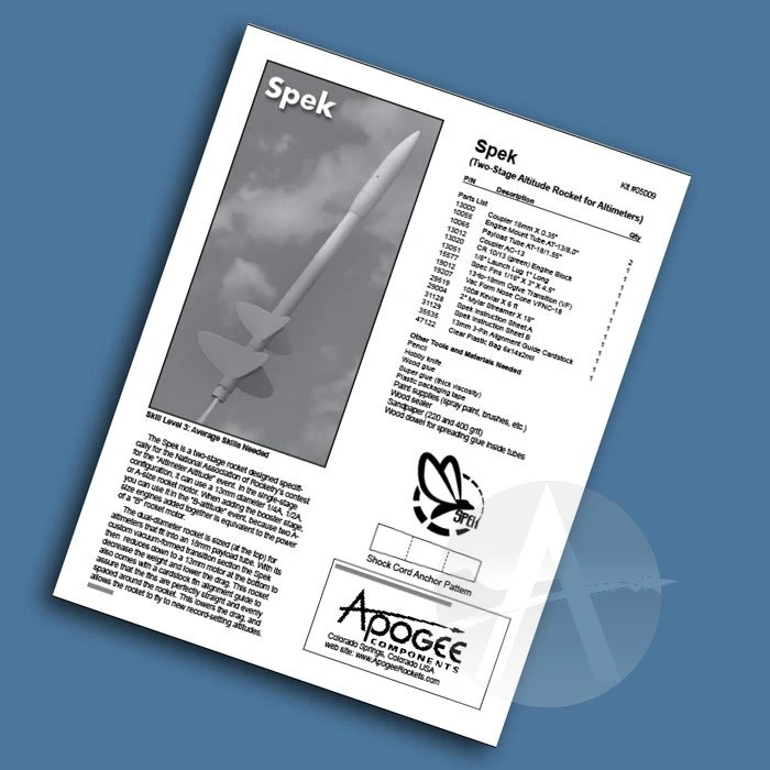 The Spek is a two-stage rocket designed specifically for the National Association of Rocketry’s contest for the “Altimeter Altitude” event. In the single-stage configuration, it can use a 13mm diameter 1/4A, 1/2A, or A-size rocket motor. When adding the booster stage, you can use it in the “B-altitude” event, because two A-size engines added together is equivalent to the power of a “B” rocket motor.