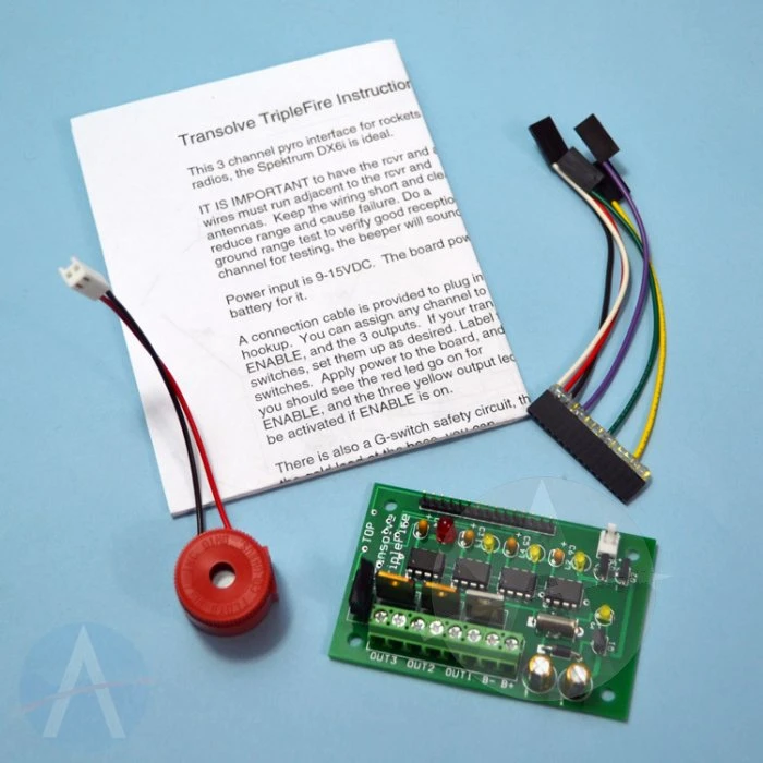 Allows you to manually control pyro outputs on your high-power rocket with an RC radio. Useful for staging, air-starts, and parachute deployment charges. Allows firing of 3 different pyro outputs, with a 4 channel spread spectrum radio.